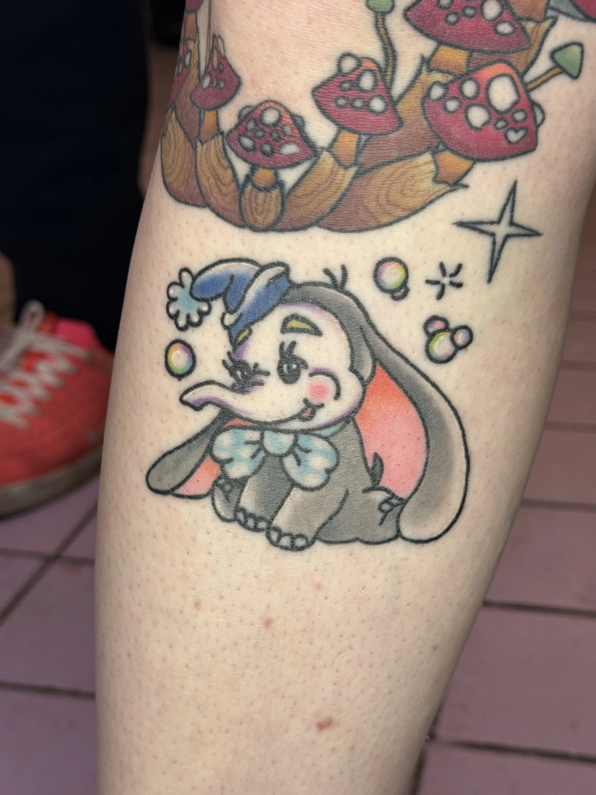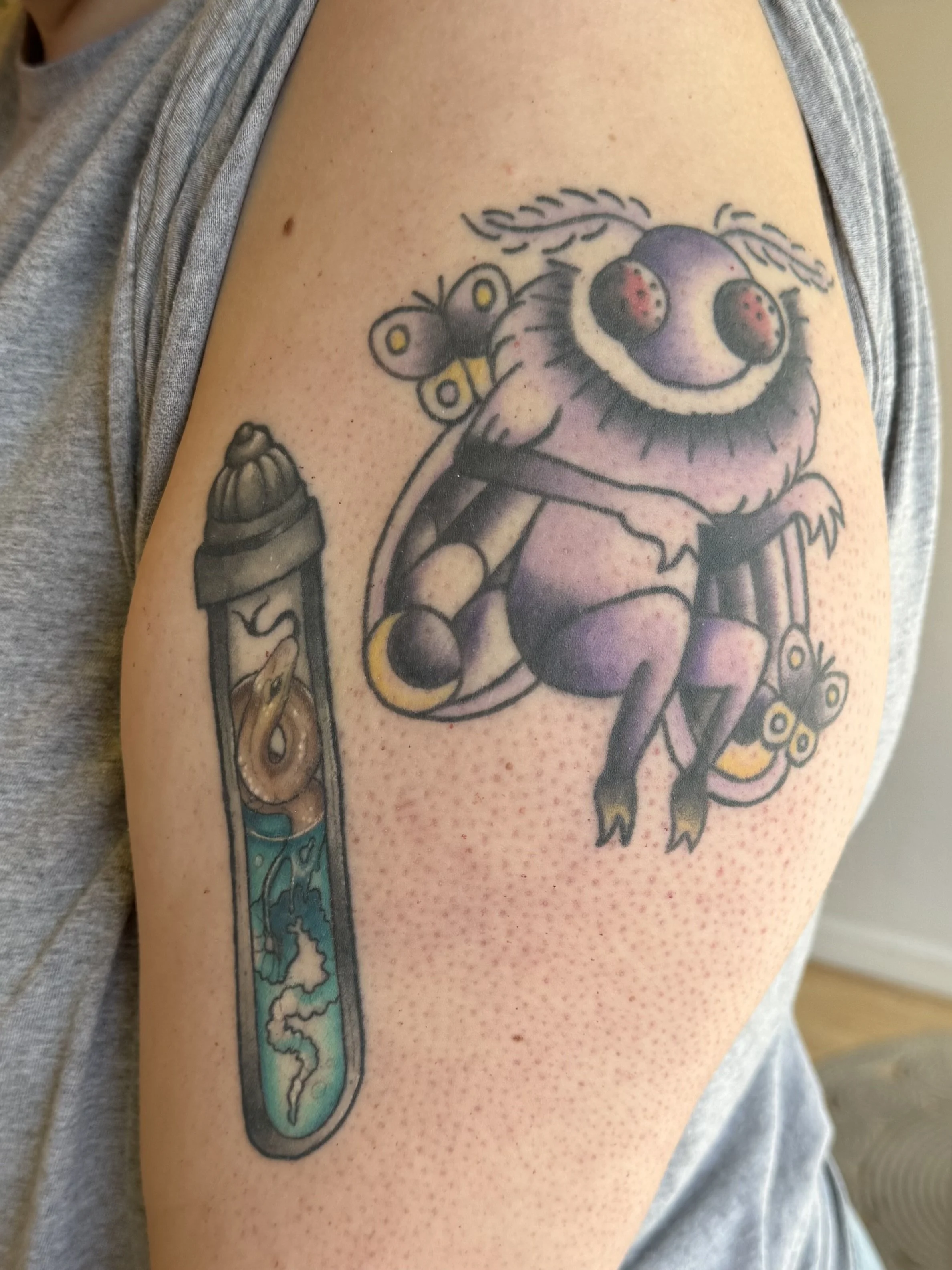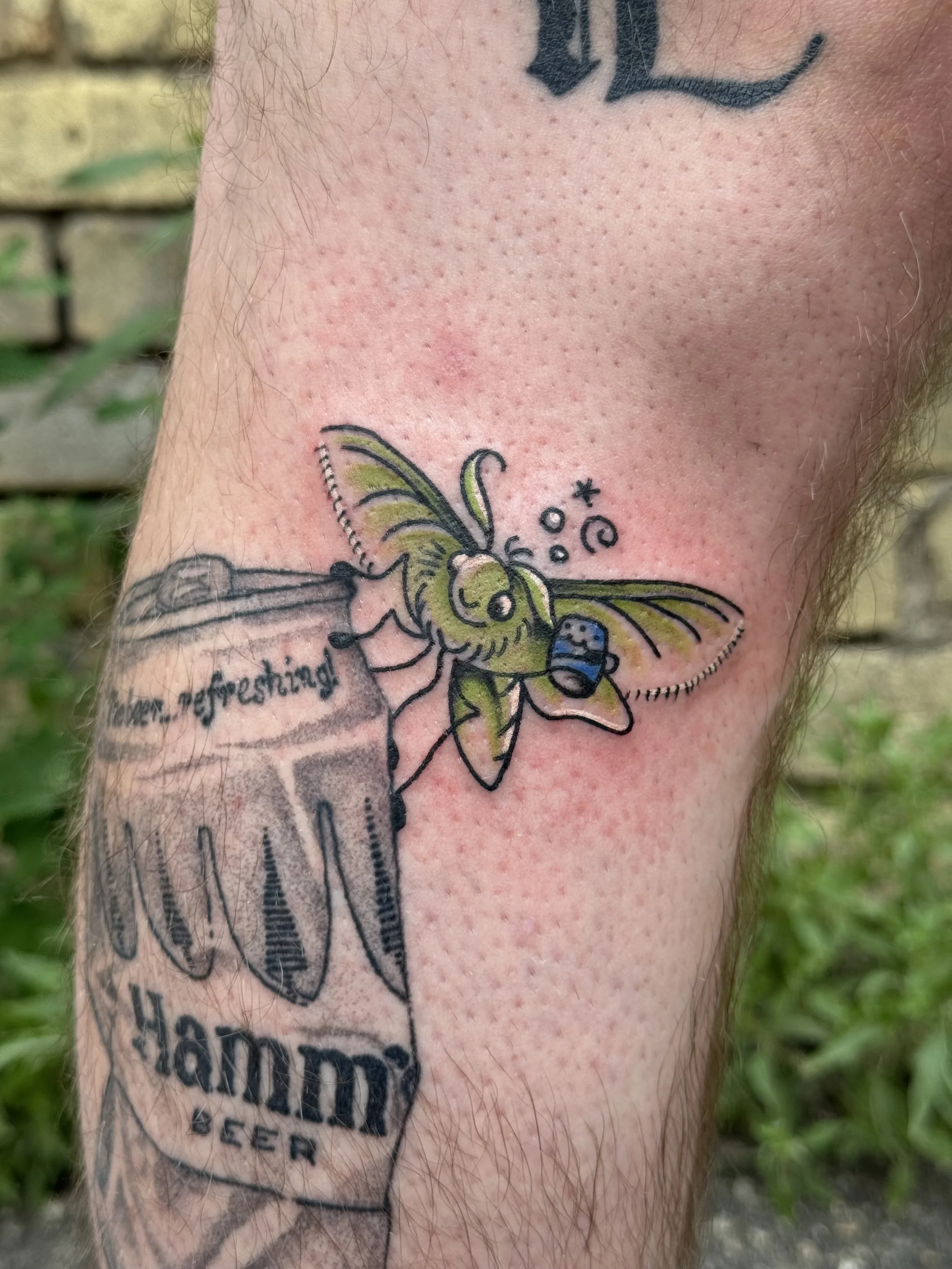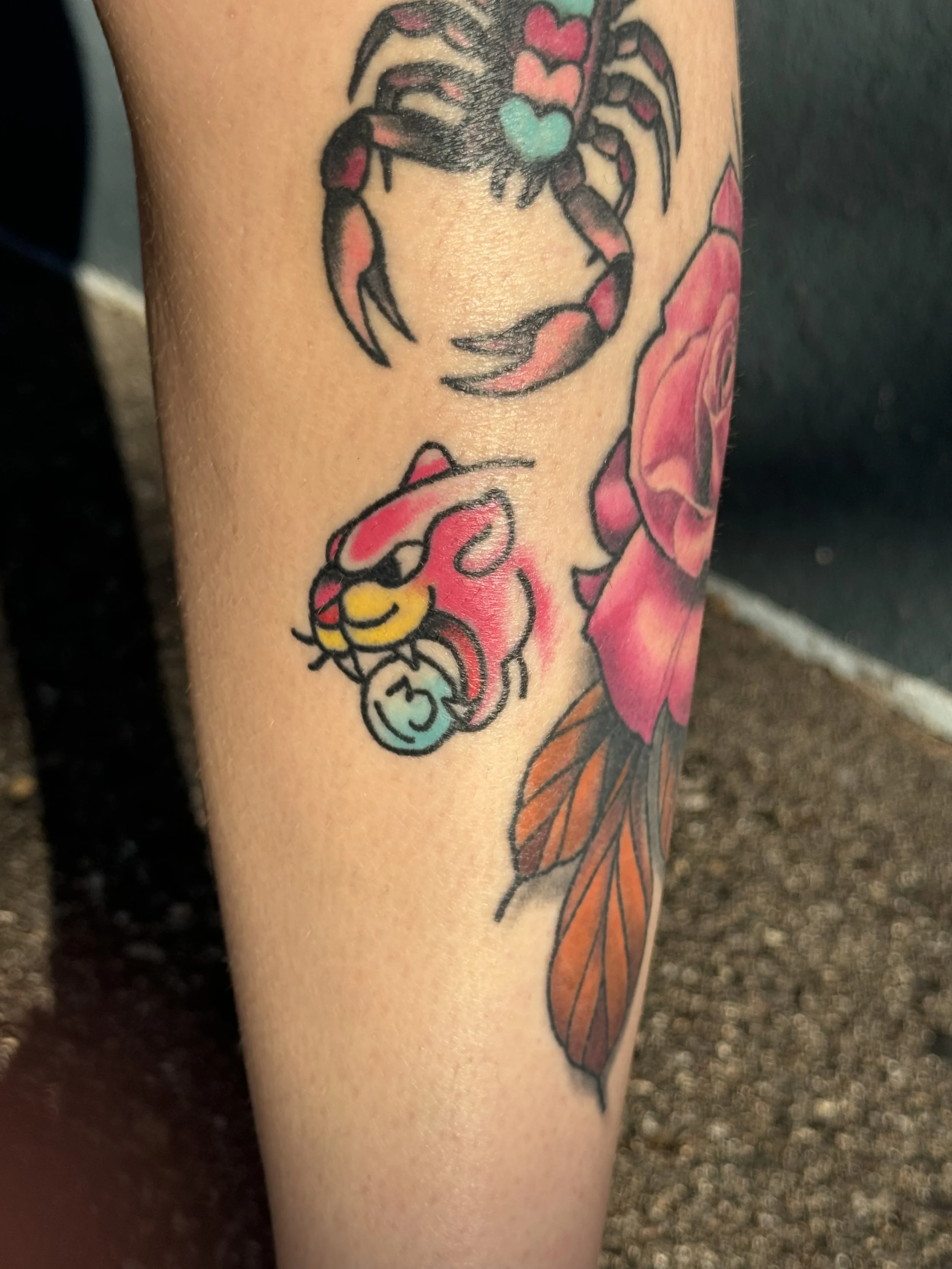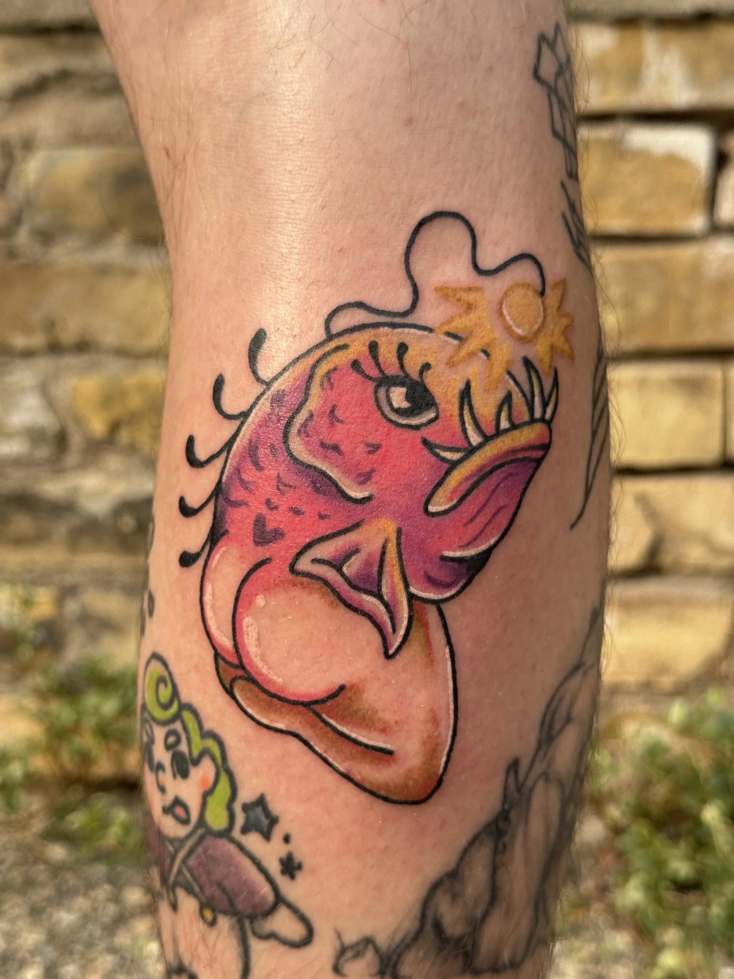 Outside of tattooing Kay enjoys a wide range of other mediums like acrylic gouache, watercolor, clay and colored pencil. She also likes making sticker designs digitally and even prints + cuts them at home! You can often find Kay at Odd Mart or other local market spots in Minneapolis selling and showing her art as the tattoo slinging clown she is.